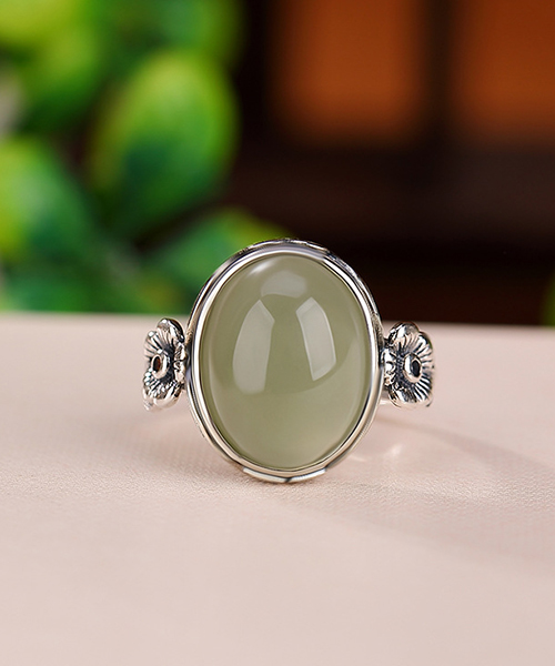 Natural Jade Cabochon Flower Design S925 Open Ring