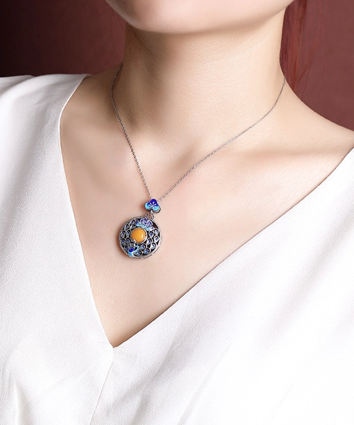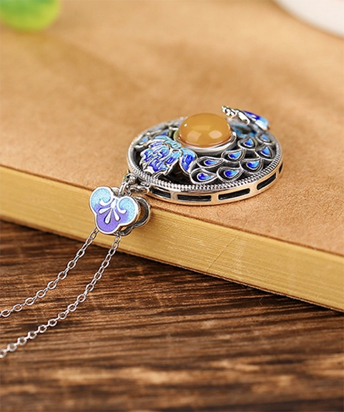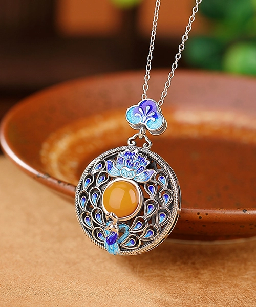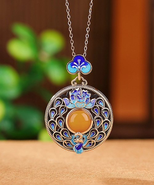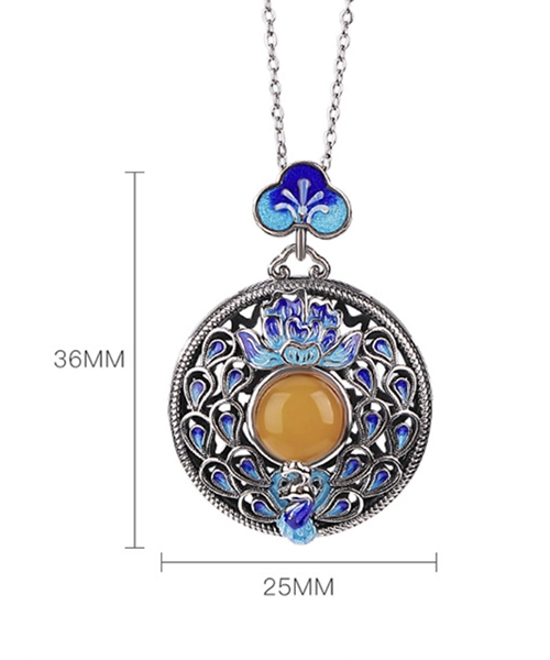 S925 Peacock Amber Cabochon Pendant